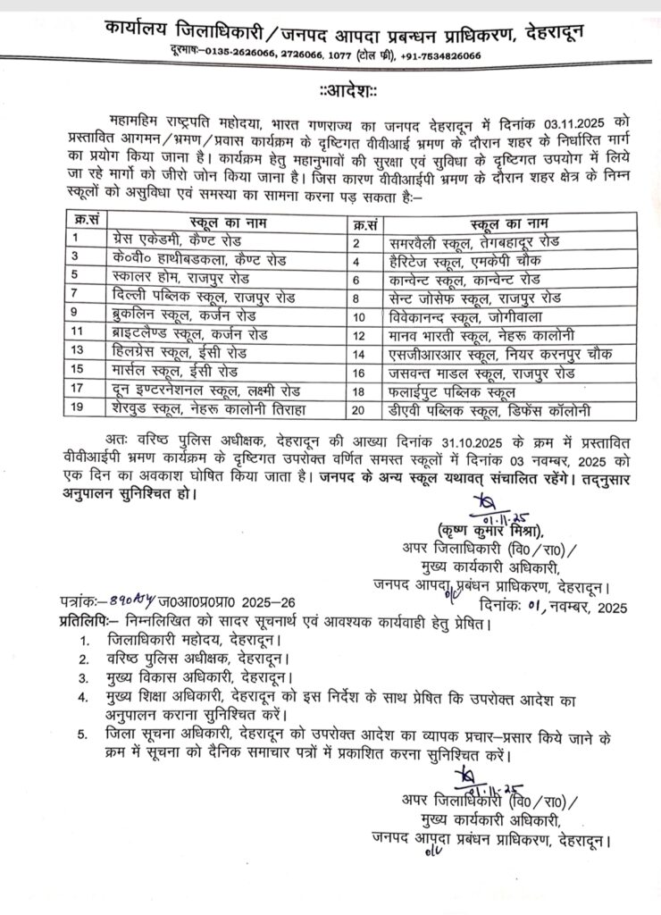 देहरादून: राष्ट्रपति द्रोपदी मुर्मू के देहरादून आगमन/भ्रमण व प्रवास कार्यक्रम को लेकर सोमवार को 20 स्कूलों में छुट्टी की गई है। जिलाधिकारी सविन बंसल ने इस संबंध में आदेश जारी कर दिया है।
