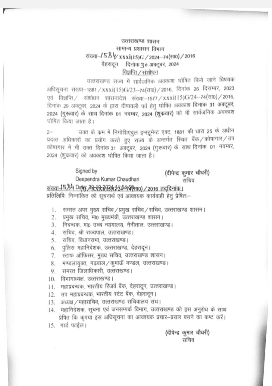 देहरादून: सरकारी कर्मचारियों के विरोध को देखते हुए सरकार ने दीपावली पर एक और छुट्टी घोषित कर दी है। अब 31 अक्टूबर के साथ 1 नवंबर को भी अवकाश घोषित कर दिया है। सरकार की ओर से पहले दीपावली को लेकर 1 नवंबर को अवकाश घोषित किया गया था। इसके बाद दीपावली को लेकर सस्पेंस हुआ तो शासन ने 01 नवंबर की जगह 31 अक्टूबर को सरकारी अवकाश घोषित कर दिया।