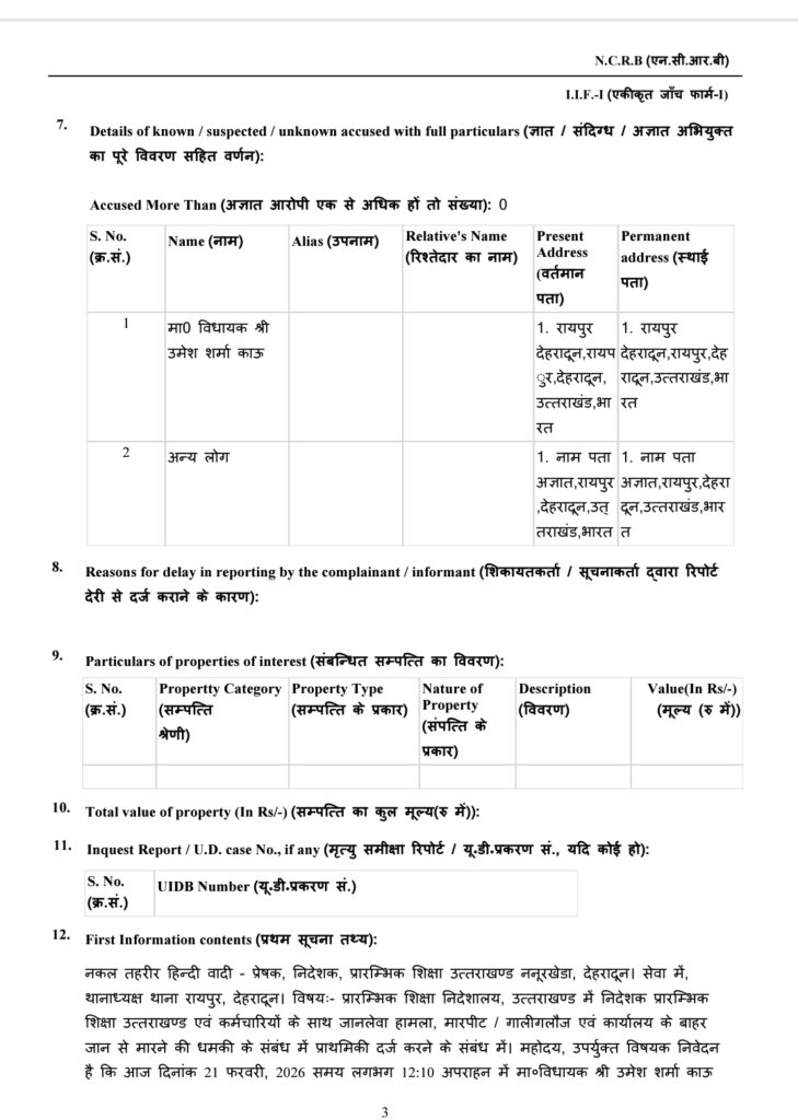 देहरादून: निदेशक प्रारंभिक शिक्षा अजय कुमार नौडियाल पर हमला करने के आरोप में रायपुर थाने में विधायक उमेश शर्मा काऊ व उनके समर्थकों के विरुद्ध मुकदमा दर्ज किया गया है। पुलिस को दी शिकायत में शिक्षा निदेशक ने कहा कि 21 फरवरी की दोपहर 12:10 बजे विधायक उमेश शर्मा काऊ एवं उनके कई समर्थक उनके कार्यालय कक्ष, निदेशालय प्रारंभिक शिक्षा ननूरखेडा पहुंचे। इसकी उन्हें पूर्व सूचना नहीं थी।