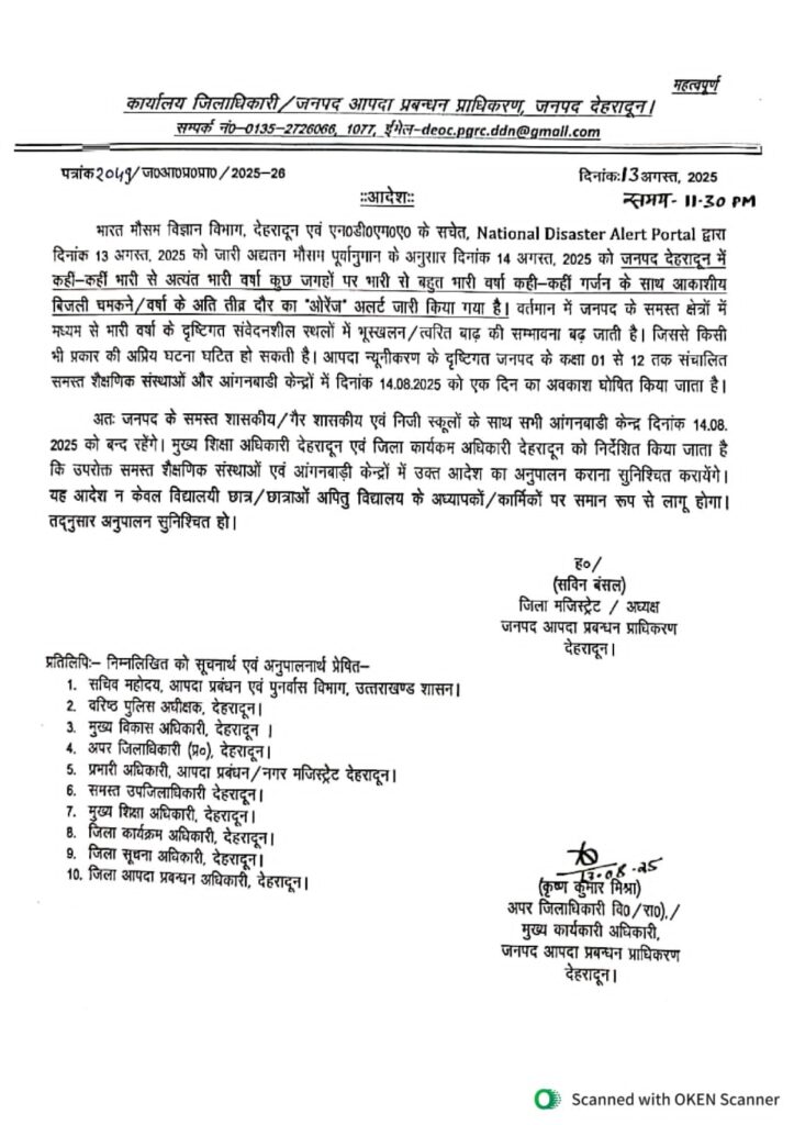 भारी बारिश के चलते आज भी स्कूलों में छुट्टी, देर रात डीएम ने आदेश किया जारी
