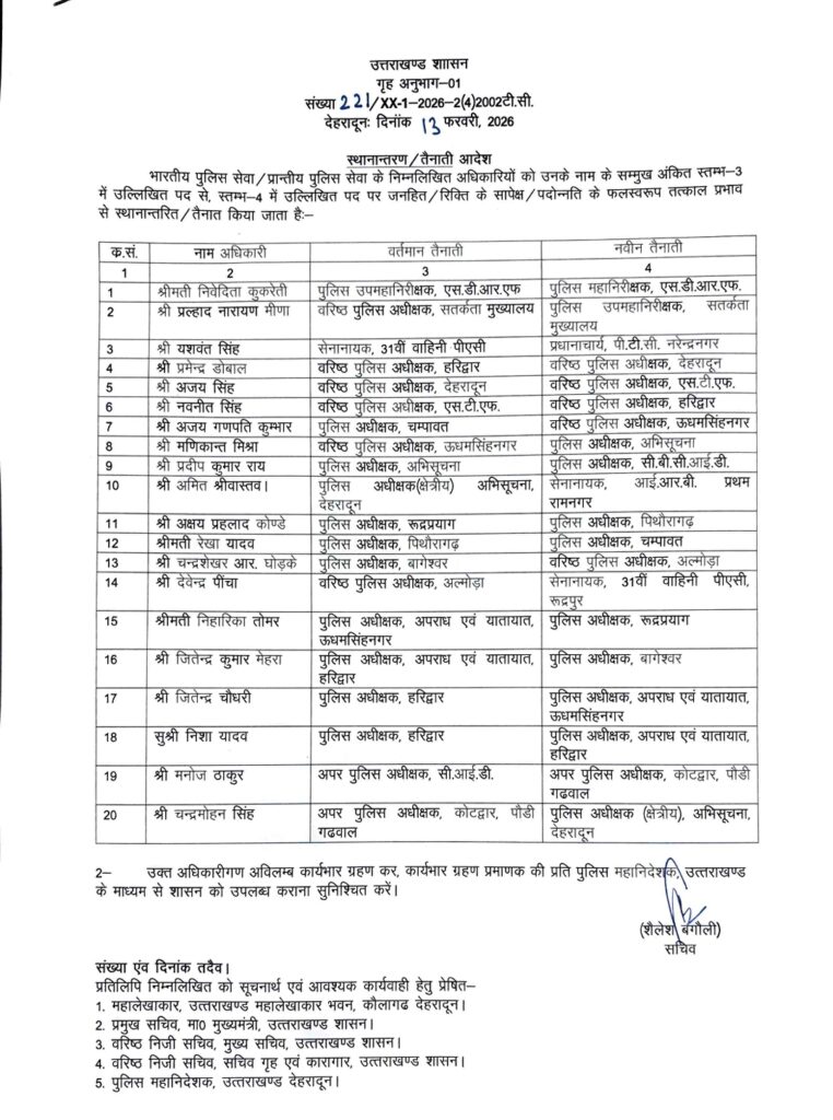 वहीं एसएसपी उधमसिंहनगर के एसएसपी मणिकांत मिश्रा को पुलिस अधिक्षक अभिसूचना जबकि पुलिस अधीक्षक चंपावत अजय गणपति को एसएसपी उधमसिंहनगर तैनात किया गया है।
