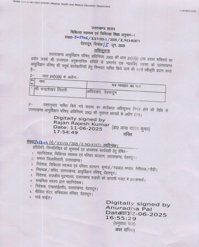 देहरादून: शासन ने वरिष्ठ अधिवक्ता चंद्रशेखर तिवारी को उत्तराखंड आयुर्विज्ञान परिषद में न्यायविद सदस्य सेवाओं के लिए नियुक्त किया है। सरकार के इस प्रस्ताव के उपरांत उत्तराखंड राज्यपाल की ओर से इस नियुक्ति के आदेश जारी किए गए। सरकार के अहम मामलों सहित कई महत्वपूर्ण कोर्ट केसों में अधिवक्ता चंद्रशेखर तिवारी की मजबूत पैरवी में अहम भूमिका रही। अब कानून की किताब को बेहतर ढंग से समझने वाले वरिष्ठ अधिवक्ता तिवारी को उत्तराखंड मेडिकल काउंसिल की न्यायविद प्रक्रिया में संवैधानिक पद पर सदस्य के रूप में नियुक्त किया गया हैं, जिसमें में वह अपनी कानूनी सेवाएं देंगे।