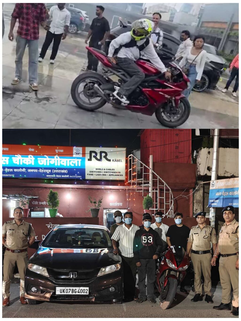 एसएसपी देहरादून अजय सिंह ने बताया कि 15 अगस्त को थाना नेहरू कालोनी को सूचना मिली कि मॉल ऑफ देहरादून की छत पर कुछ रैली कार एवं रेसर बाइक के माध्यम से स्टंट कर रहे हैं। सूचना पर चौकी प्रभारी जोगीवाला पुलिस टीम के साथ मौके पर पहुंचे। यहां पता चला कि दो मोटरसाइकिल सवार जोर-जोर से एक्सीलेटर देकर गाड़ी से धुआँ निकाल रहे थे तथा शोरगुल कर रहे थे। ये दोनों व्यक्ति पुलिस के पहुँचने से पूर्व ही वहाँ से फरार हो गए।